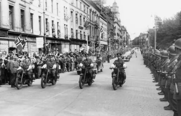 Fra Oslo under fredsdagene i 1945. Den 13.mai kommer Kronprins Olav tilbake.Kortesjen kjører oppover Karl Johans gate i retning Slottet.