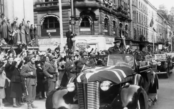 Fra Oslo under fredsdagene i 1945. Den 13.mai kommer Kronprins Olav tilbake.Kortesjen kjører oppover Karl Johans gate i retning Slottet. Kronprinsen sitter på kalesjen og hilser til de fremmøtte.