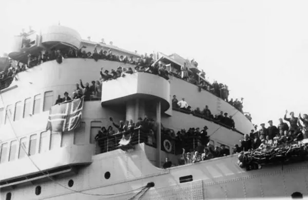 Fra Oslo under fredsdagene i 1945. Skipet Andes anløper Oslo Havn den 31.mai, med ca. 700 eksilnordmenn fra regjering og administrasjon.