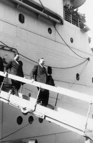 Fra Oslo under fredsdagene i 1945. Skipet Andes anløper Oslo Havn den 31.mai, med ca. 700 eksilnordmenn fra regjering og administrasjon..Her kommer statsminister Johan Nygaardsvold etterfulgt av justisminister Trygve Lie ned landgangen.