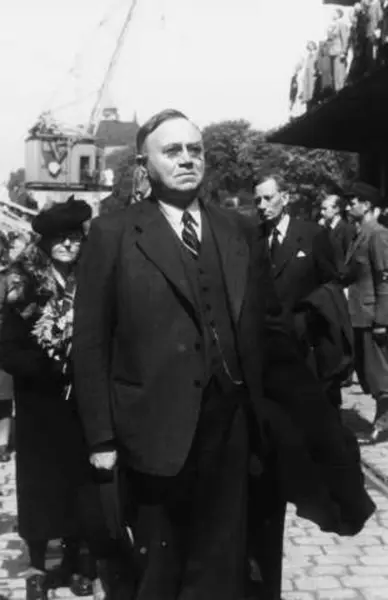 Fra Oslo under fredsdagene i 1945. Skipet Andes anløper Oslo Havn den 31.mai, med ca. 700 eksilnordmenn fra regjering og administrasjon. Her ser vi statsminister Johan Nygaardsvold og hans kone, og i bakgrunnen forsvarsminister Oscar Torp.