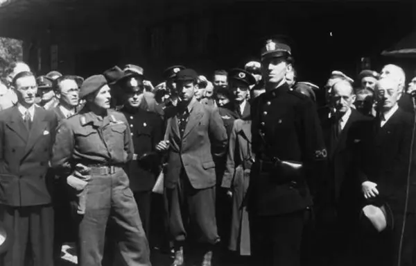 Fra Oslo under fredsdagene i 1945. Skipet Andes anløper Oslo Havn den 31.mai, med ca. 700 eksilnordmenn fra regjering og administrasjon. Her Kronprins Olav og forsvarsminister Oscar Torp, sammen med politi og resten av velkomstkommiteen.