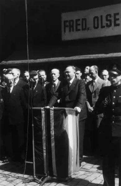 Fra Oslo under fredsdagene i 1945. Skipet Andes anløper Oslo Havn den 31.mai, med ca. 700 eksilnordmenn fra regjering og administrasjon.. Statsminister Johan Nygaardsvold på talerstolen. I bakgrunnen ser vi ordfører Einar Gerhardsen, som har holdt velkomsttalen.