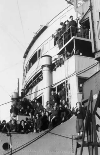 Fra Oslo under fredsdagene i 1945. Skipet Andes anløper Oslo Havn den 31.mai, med ca. 700 eksilnordmenn fra regjering og administrasjon. Her er noen av passasjerene samlet på dekk.