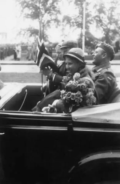 Fra Oslo under fredsdagene i 1945. Fra Kong Haakons tilbakekomst den 7.juni. Her bilen med kronprinsen og prinsebarna.
