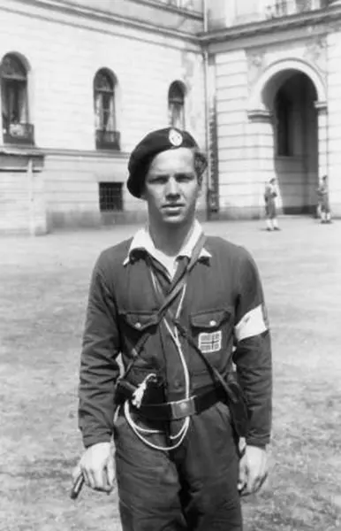 Fra Oslo under fredsdagene i 1945. Fra paraden den 9.juni. Her en bevepnet hjemmefrontsmann i uniform foran slottet.