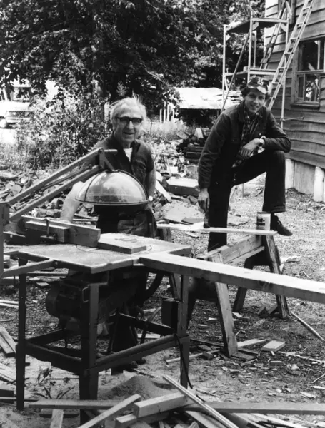 Byggmester John Folland og sivilarbeider Ivar Jørstad i arbeid på museet i 1982.