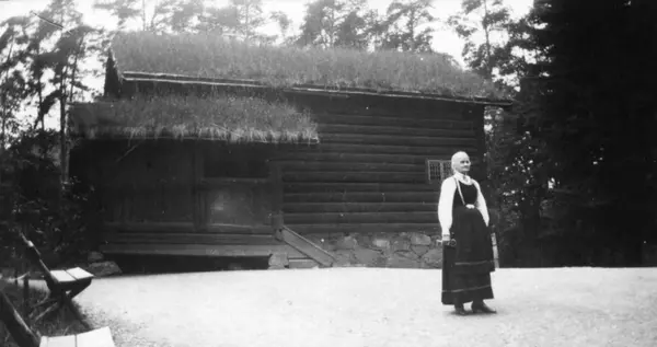 Ansatte, forøvrig museets eldste person i 1929, Asgjerd Haugen utenfor Hovestua, bygning nr.182, på Norsk Folkemuseum.