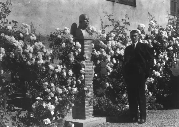 Ansatte Gisle Midttun ved bysten av Hans Aall, omkranset av roser. Foran Bybygningen, bygning nr. 312, på Norsk Folkemuseum.