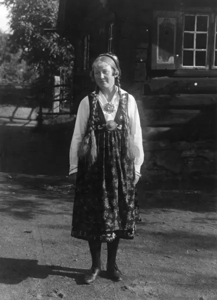 Vert, antagelig Gunhild Knudsen, i drakt foran Gulsvikstua, bygning nr. 121 i Hallingdalstunet på Norsk Folkemuseum.