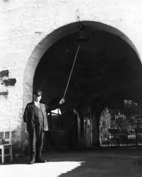 Portvakten, Andresen foran Bergensporten, bygning nr. 301 på Norsk Folkemuseum, der han ringer til frokost.