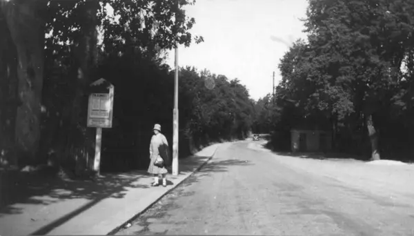 Ansatte, assistent Aagot Mathiesen ute på veien under skiltet til Norsk Folkemuseum.