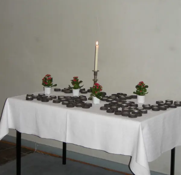 Allehelgensdag i Tonsen kirke, Oslo, 04.11.2007. Lystenningsbord bakerst i kirken. Telys, blomster og lysestake med tent lys.