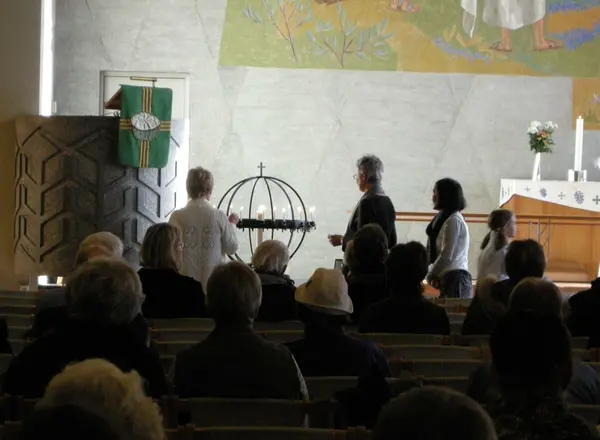 Allehelgensdag i Tonsen kirke, Oslo, 04.11.2007. Vandring og lystenningsmeditasjon under gudstjenesten. Tenning av lys i lysglobe. Prekestol med grønt klede utstmykket med kors og brødkurv. Alter.