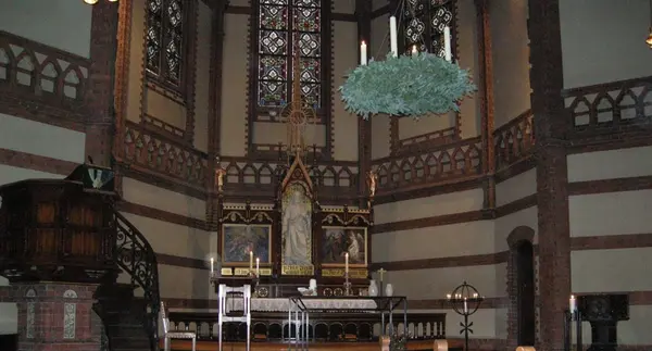 Paulus kirke i Oslo, 2. søndag i advent, 09.12.2007. Fra kirkerommet. Krans av granbar med fire hvite lys henger i taket over midtgangen foran koret. Prekestol, alter, altertavle, døpefont og lysglobe i bakgrunnen.