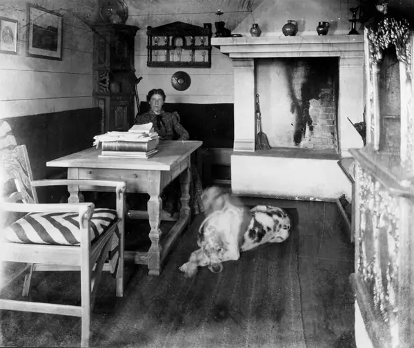 Emma Aall, f. Lund, og vakthunden Leo i dagligstuen i direktørboligen, Norsk Folkemuseum.