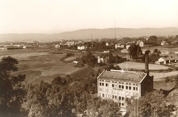 Fabrikkbygning (Nye veveri) til A/S Joh. Petersens Linvarefabrik med boliger og jorder i bakgrunnen.