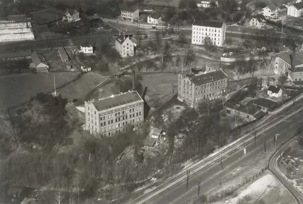 Bygninger ved A/S Joh. Petersens Linvarefabrik. Forstadsbane, jernbanespor og boliger. Gartneri i bakgrunnen.