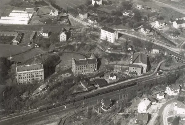 Bygninger ved A/S Joh. Petersens Linvarefabrik. Forstadsbane, jernbanespor og boliger. Gartneri i bakgrunnen.