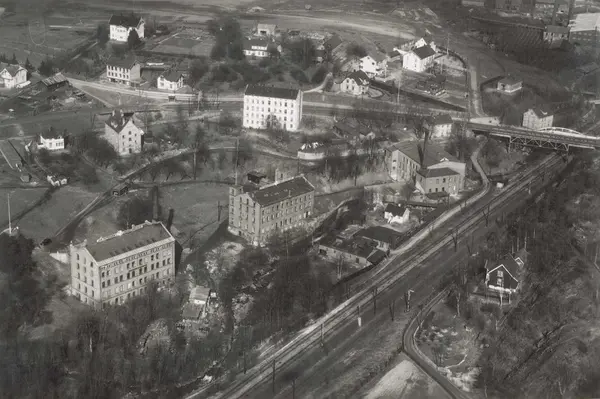 Bygninger ved A/S Joh. Petersens Linvarefabrik. Forstadsbane, jernbanespor, boliger og gartneri.