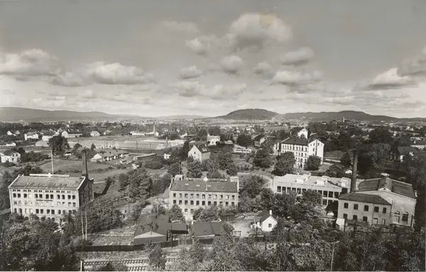 Bygninger ved A/S Joh. Petersens Linvarefabrik. Forstadsbebyggelse og gartneri i bakgrunnen.