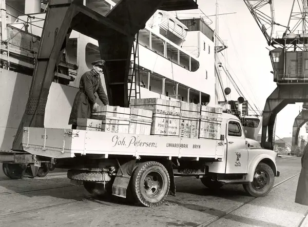 Lastebil fra A/S Joh. Petersens Linvarefabrik og truck laster kasser på brygga, ved skip.