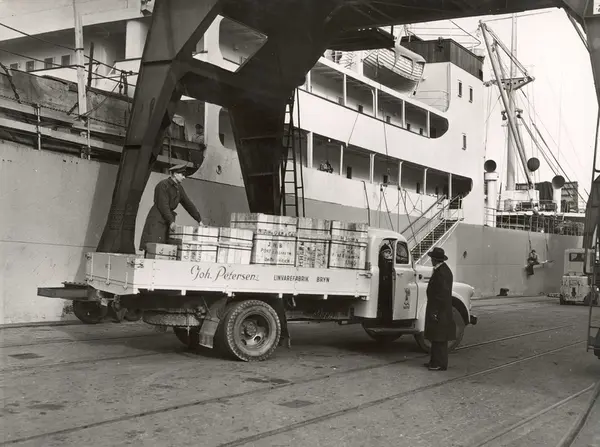 Lastebil fra A/S Joh. Petersens Linvarefabrik med kasser på brygga ved skip.