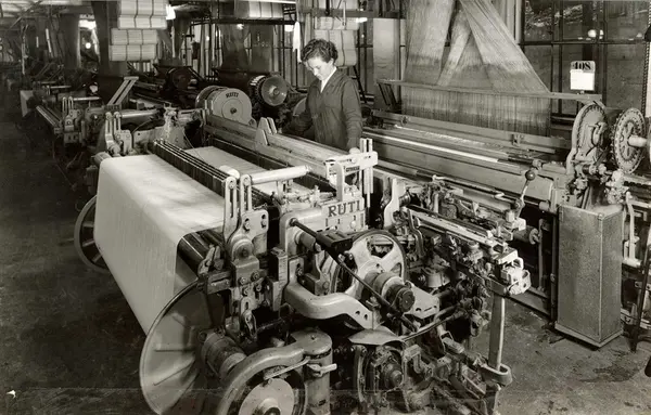Produksjonslokale ved A/S Joh. Petersens Linvarefabrik. Kvinne ved vevstol.