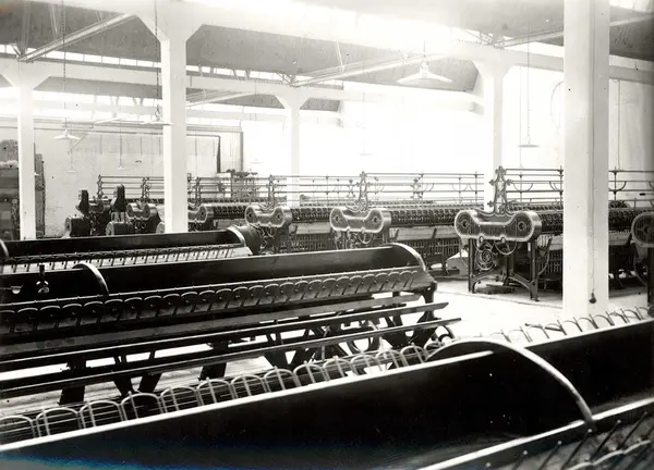 Produksjonslokale med våtspinnemaskiner ved A/S Joh. Petersens Linvarefabrik.