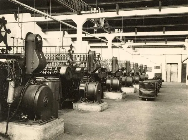 Produksjonslokale med våtspinnemaskiner ved A/S Joh. Petersens Linvarefabrik.