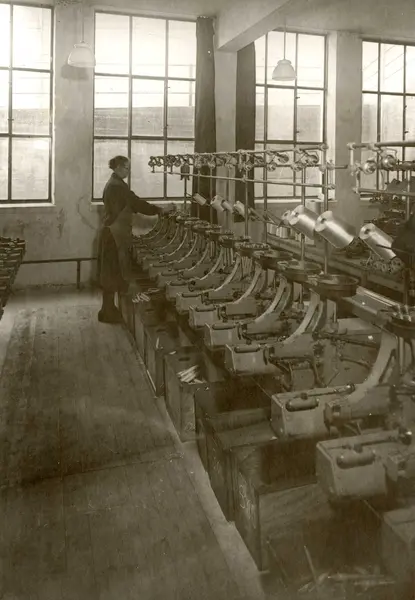 Produksjonslokale med kvinne som betjener spolemaskin ved A/S Joh. Petersens Linvarefabrik.