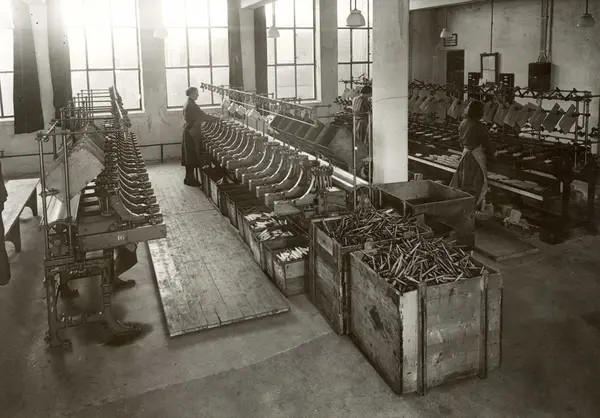 Produksjonslokale med kvinne som betjener spolemaskin ved A/S Joh. Petersens Linvarefabrik.