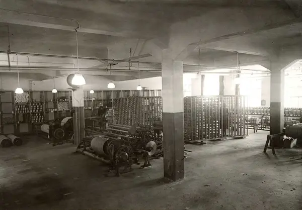 Rennemaskiner ved A/S Joh. Petersens Linvarefabrik. Kvinne betjener maskin.