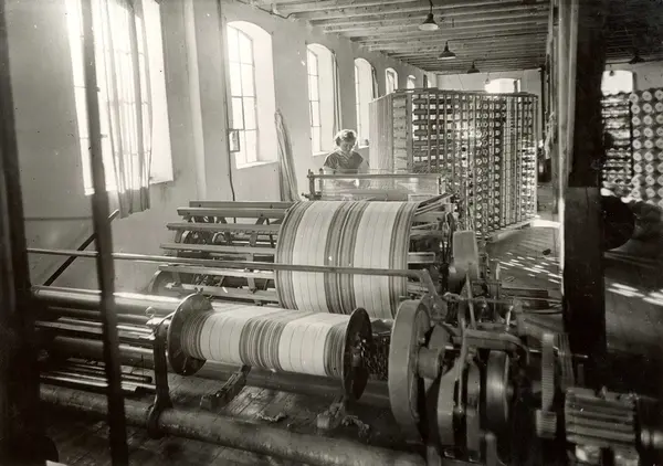 Rennemaskin ved A/S Joh. Petersens Linvarefabrik. Kvinne betjener maskin.