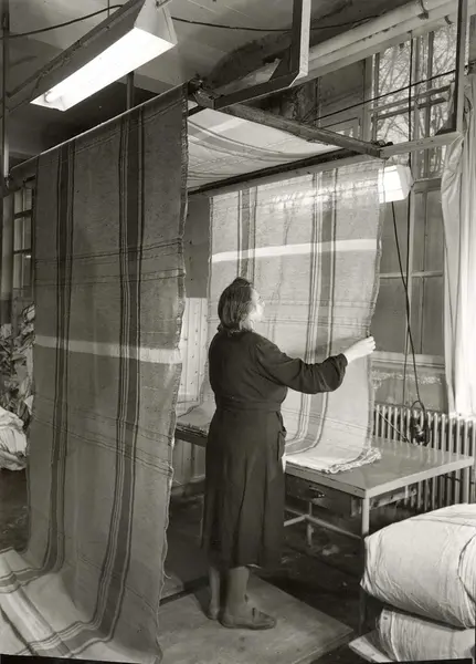 Kvinne kontrollerer ferdigvare foran lysrør ved A/S Joh. Petersens Linvarefabrik.