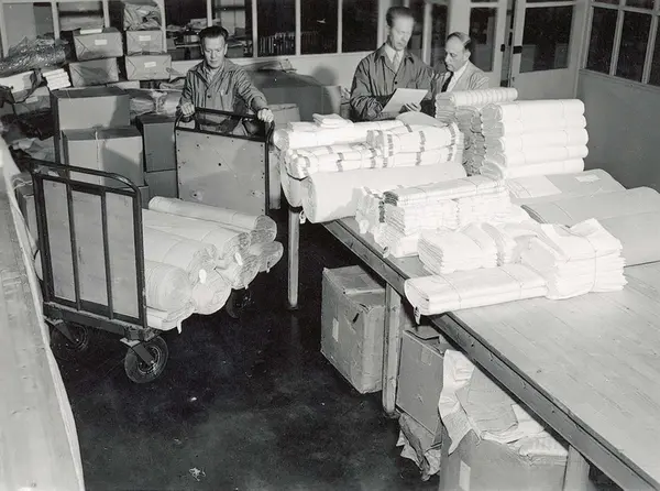 Menn med stabler og ruller med tekstil på bord og traller. A/S Joh. Petersens Linvarefabrik.