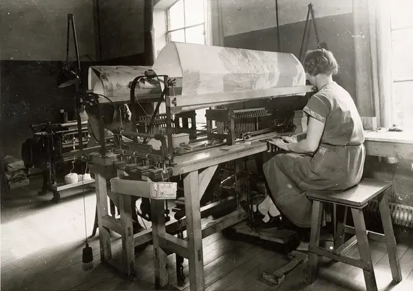 Kvinne arbeider med mønster på maskin ved A/S Joh. Petersens Linvarefabrik.