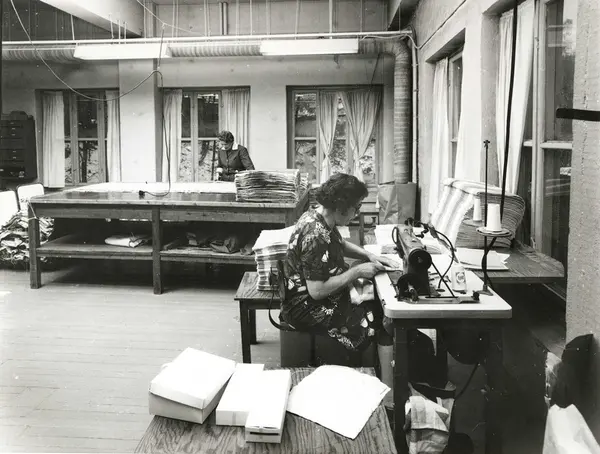 Systuen ved Fortex A/S. En kvinne ved symaskin og en annan pakker.