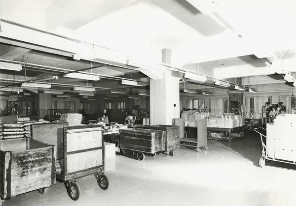 Systuen ved Fortex A/S. Traller og stabler med tekstil.