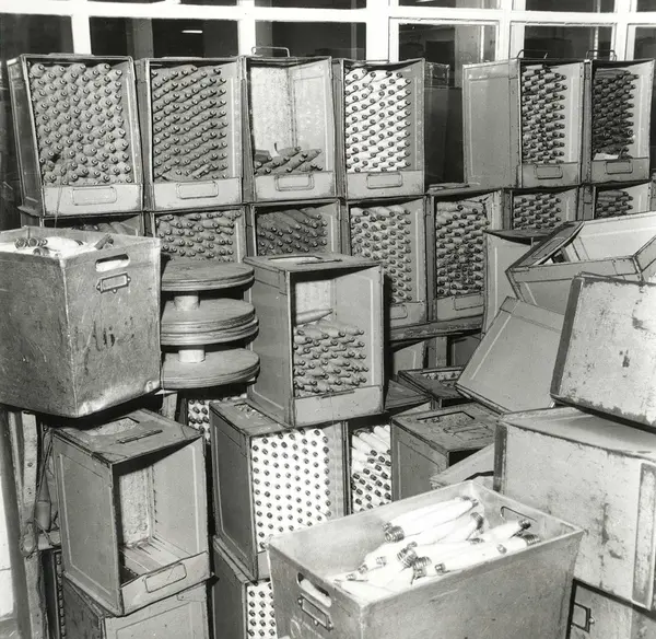 Fotografiene kom inn til museet med annet gjenstandsmateriale fra Fortex fabrikken, ved dennes nedleggelse i 1976. Christiania Seilduksfabrik, grunnlagt 1856, fusjonerte i 1960 med A/S Joh. Petersen Linvarefabrik, grunnlagt 1854, til Fortex A/S. Norges siste damaskveveri. Bilder tatt forbindelse med nedleggelsen av Fortex A/S i 1976. Notert på bildet: Ved spolesentralen stod en gammel vekt som ble brukt ved akkordarbeidet.