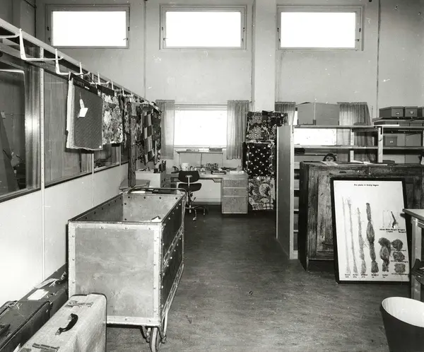 Fotografiene kom inn til museet med annet gjenstandsmateriale fra Fortex fabrikken, ved dennes nedleggelse i 1976. Christiania Seilduksfabrik, grunnlagt 1856, fusjonerte i 1960 med A/S Joh. Petersen Linvarefabrik, grunnlagt 1854, til Fortex A/S. Norges siste damaskveveri. Bilder tatt forbindelse med nedleggelsen av Fortex A/S i 1976. Notert bak på bildet: Hyllene til høyre var fulle av esker, slik man ser i bakgrunnen. Her var det to arbeidsplasser.