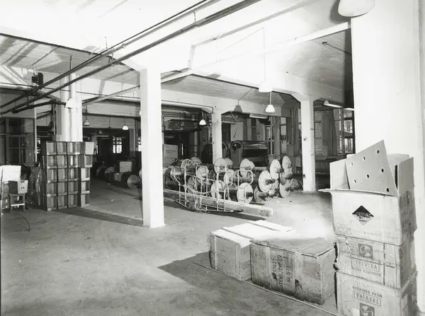 Fotografiene kom inn til museet med annet gjenstandsmateriale fra Fortex fabrikken, ved dennes nedleggelse i 1976. Christiania Seilduksfabrik, grunnlagt 1856, fusjonerte i 1960 med A/S Joh. Petersen Linvarefabrik, grunnlagt 1854, til Fortex A/S. Norges siste damaskveveri. Bilder tatt forbindelse med nedleggelsen av Fortex A/S i 1976. Notert på bildet: Smittemaskinen står i bakgrunnenved vinduet, den ble brukt til apperatur av garnet. Det var plass til 8 bommer, kjørt ned i traug med "smittestoff" så garnet ble sterkere i veven, deretter tørket i tromlene og kjørt opp på vevbom. Smittemaskinen ble betjent av formannen for forberedelsesavdelingen. Opprinnelig stod her tre spolemaskiner med 36 spindere hver, betjent av to kvinner To av spolemaskinene ble flyttet opp i veveriet ca. 1975 Fra spolemaskinen falt garnet ned i kasser, derfra til spolesentralen.