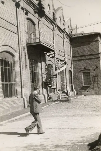 Fortex A/S. Mann spaserer over gårdsplass på Seilduksfabrikken.