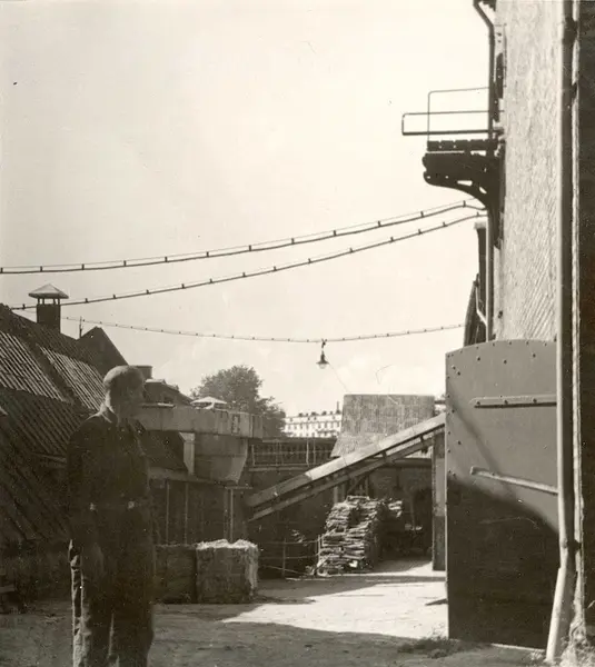 Fortex A/S. Hekleriformann Elias Krogeide i gårdsplass på Seilduksfabrikken