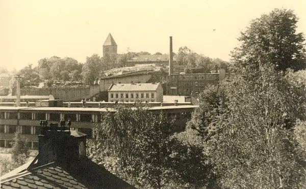 Fortex A/S. Utsikt fra Seilduksfabrikken, fra vinduet på "Tvinnerikontoret", mot Gamle Aker Kirke.