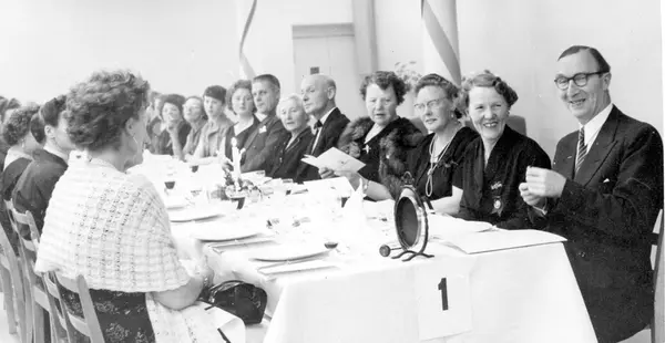 Christiania Seildugsfabriks jubileumsmiddag. Toastmaster Sverre Nielsen og fru Rønnaug Friberg som holdt tale.