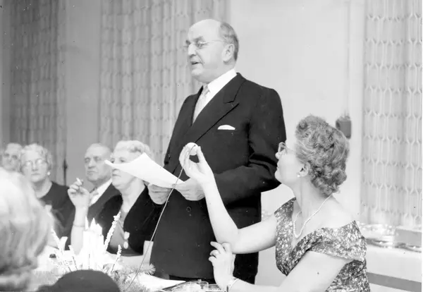 Christiania Seildugsfabriks jubileumsmiddag. Mann holder tale.