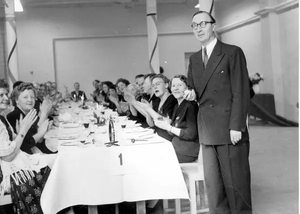 Christiania Seildugsfabriks jubileumsmiddag. Sverre Nielsen takker korpset for musikken.