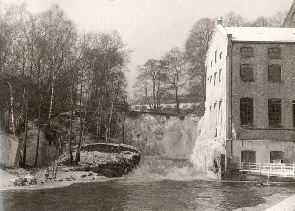 Album fra Christiania Seildugsfabrik. Fabrikkbygning, Akerselva og fossen med is.
