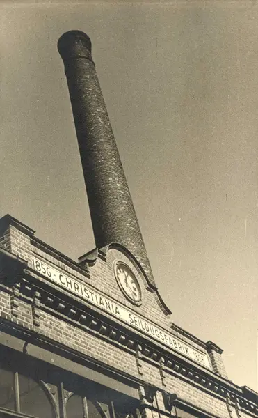 Album fra Christiania Seildugsfabrik. Fabrikkbygning, skilt, klokke og pipe.